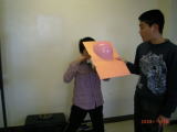 全員完成したあとは、競争です。長さ約5メートル、幅約1,5メートルのコースを作って走らせました。走る力はふくらませる風船の中の空気が吹き出すときの力ですから、大きくふくらませるほどよく走ります。しかし、これでは競争になりません。そこで、リーダーが丸い穴があいた厚紙を持ってきました。この穴を通り抜ける大きさでないと駄目、と言う条件にしたのです。全員2回走らせました。まっすぐ走らせるのは案外難しく完走したのは3人くらいでした。途中でコースを外れたものはその地点までの走った距離で順位を決めました。