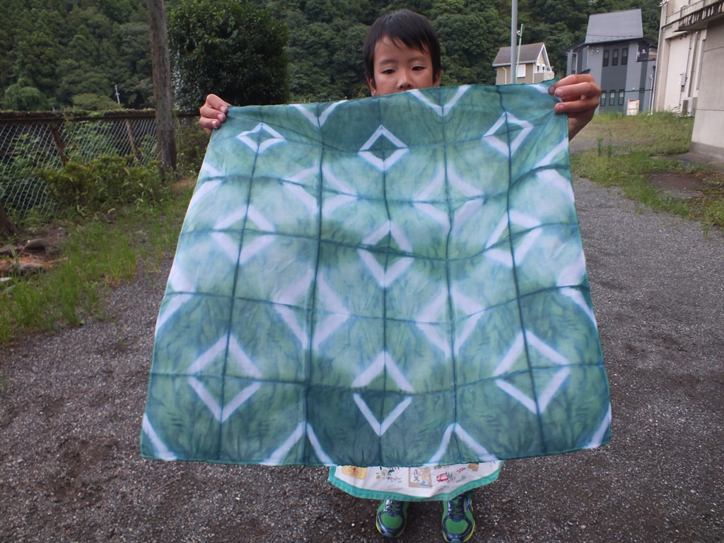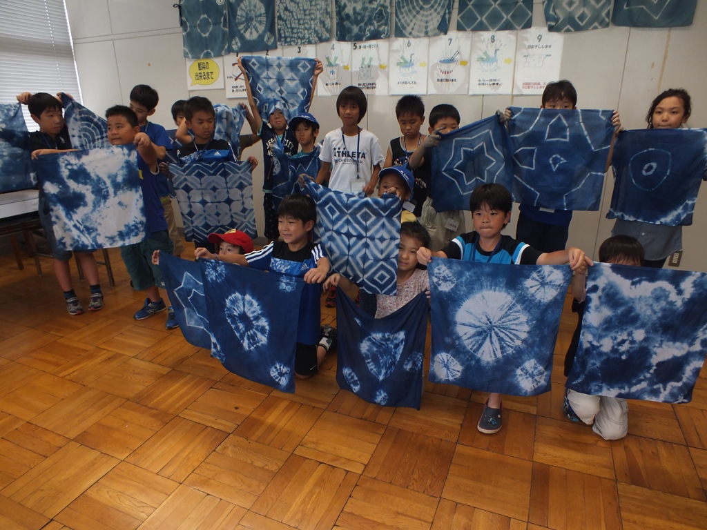 2日目は7時に起床、後片付けと朝食の後に工芸の体験をしました。午前中はふれあいの村で木のスプーン、フォーク作りです。 ふれあいの村で取れた木の枝をナイフで削り、スプーン、フォークをつけて色を塗ったらニスで仕上げです。 低学年の子も安全指導を受けながらナイフを握り、きれいなスプーンを作りました。昼食後は愛川の繊維会館まで歩き、そこで藍染体験をしました。 白い布を折ったり、つまんだりして割り箸で止めて、白く抜く模様を作ります。係の方から基本的な模様の作り方を教えてもらい、出来る模様を想像しながら折りました。 その後は染めの作業です。発酵した藍のにおいや、浸けた藍の液から取り出したときは緑色の藍が、空気にさらすことで藍色に変わる様子に驚きながら作品を仕上げました。 出来上がった作品を手に集合写真を取り、14時半に無事解散しました。