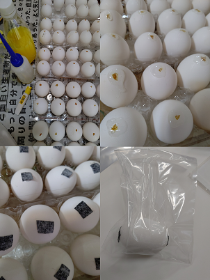 落下できるのは一人2回まで。なお、鶏卵は小さな穴をあけ、中身を抜き、色水を入れたものをビニールに入れて使用しました。
